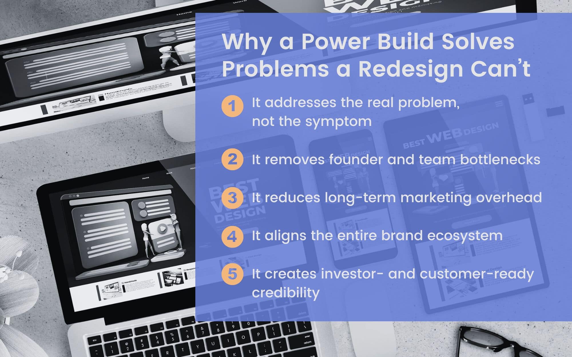 A redesign can offer some of this relief. But a Power Build creates it sustainably by aligning visuals, messaging, UX, operations, and strategy as one cohesive system.